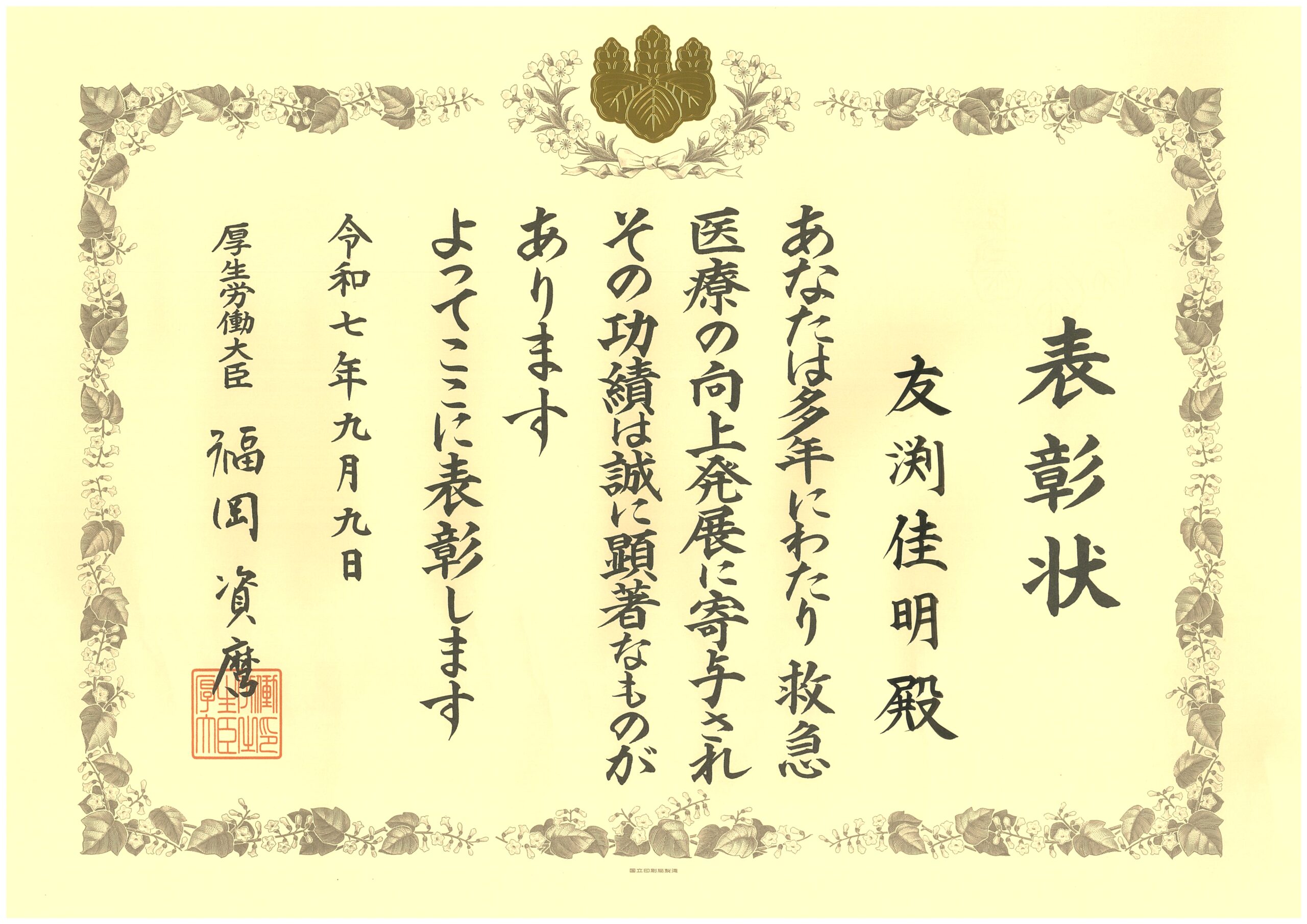 救急医療功労者厚生労働大臣表彰受賞しました 2025.12.18 令和7年9月9日(火)に、本年度の救急医療功労者厚生労働大臣表彰の表彰式が開催され、 当院院長の友渕医師が受賞しました。この表彰は、厚生労働大臣が、都道府県知事の推薦のもと、 長年にわたり地域の救急医療の確保や救急医療対策の推進に貢献した個人や団体、 医療機関の功績を称えるものです。 循環器内科医として長年にわたって地域の救急医療を支えてこられた友渕医師の功績が認められ、 今回の受賞に至りました。 今後も、地域の皆様の安心と安全を守るため、救急医療の現場で力を尽くしてまいります。 年末年始の外来診療および面会について 前の記事 誠佑記念病院公式Instagramはじめました! 次の記事